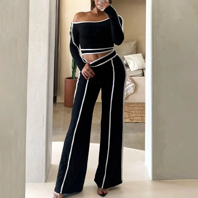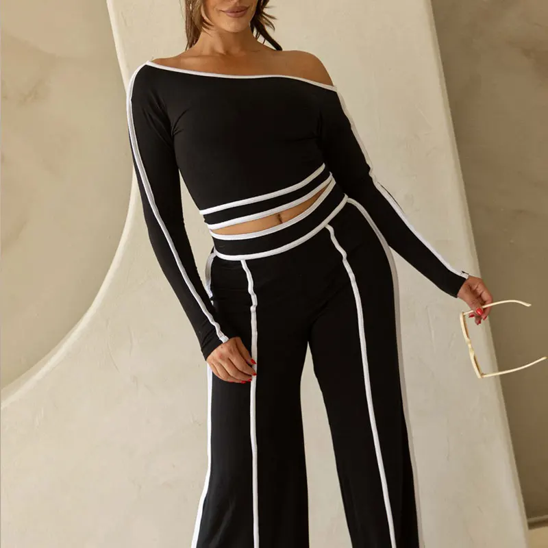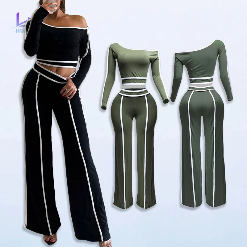 Huili Manufacturer Oem Slash Neck Black Two Piece Set Clothing Crop Top & Baggy Sweatpants Custom logo Elegant Women's Sets 2025